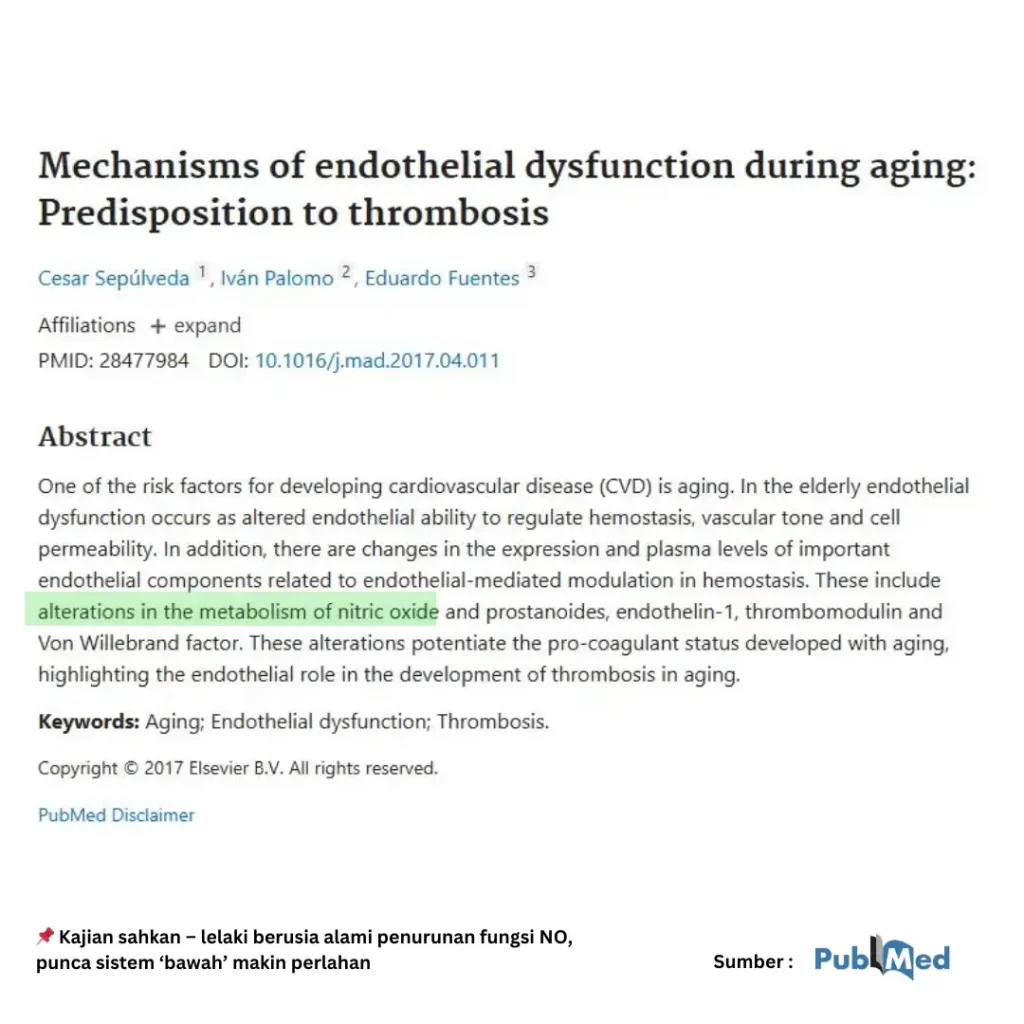 Kajian Elsevier (2017) dapati, bila fungsi endothelial menurun, penghasilan Nitric Oxide (NO) juga turun dan aliran darah ke zakar makin perlahan.
