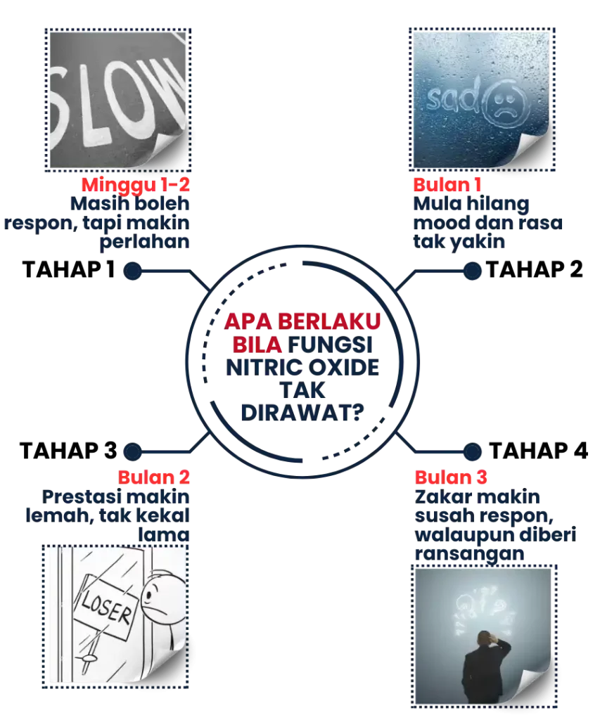 Bila dibiarkan, NO makin merosot. Ini sebab kenapa makin ramai lelaki 30 tahun ke atas mula alami prestasi yang makin perlahan.